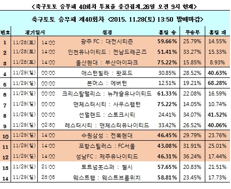 체육진흥투표권 수탁사업자인 케이토토(www.ktoto.co.kr)가 오는 28일과 29일에 벌어지는 국내프로축구 K리그클래식 6경기와 잉글랜드프로축구 프리미어리그(EPL) 8경기 등 총 14경기를 대상으로 한 축구토토 승무패 40회차를 발행한다.