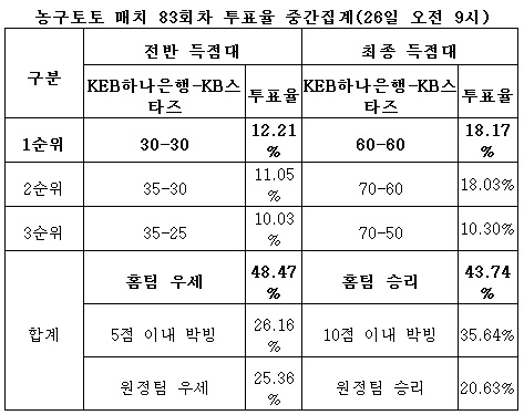 체육진흥투표권 수탁사업자인 케이토토는(www.ktoto.co.kr)는 오는 27일 오후 7시에 부천실내체육관에서 열리는 KEB하나은행-KB스타즈전을 대상으로 한 농구토토 W매치 83회차 투표율을 중간 집계한 결과, 전체 참가자의 43.74%가 홈팀 KEB하나은행의 승리를 예상하는 것으로 나타났다고 밝혔다.