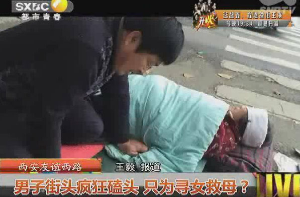 최근 중국 서안시의 노상에서 병색이 완연한 노파가 노상에 이불을 깔고 누워있고, 그 옆에서는 노파의 아들이 병원비를 위한 구걸을 하는 모습이 시안 방송에 포착 되었다.