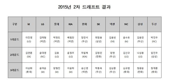 한편 2차 드래프트는 2011년 11월부터 2년 주기로 개최되고 있다. 제1회 2차 드래프트에서 27명의 선수가 유니폼을 갈아입었고, 2013년 제2회 2차 드래프트에선 34명의 선수가 이적했다. 2차 드래프트 성공사례로는 이재학(NC) 김성배(롯데) 신용운(삼성) 박근홍(삼성)(제1회 2차 드래프트), 김태영(KIA) 심수창(롯데) 허준혁(두산)(제2회 2차 드래프트)이 꼽히고 있다. / drjose7@osen.co.kr