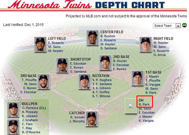 MLB.com 미네소타 공식 홈페이지의 '뎁스차트'에도 박병호가 새롭게 업데이트됐다. 뎁스차트는 현재 로스터에 등록돼 있는 선수들을 팀 내 포지션과 비중에 따라 순서대로 배치한 표인데 박병호는 당당히 미네소타의 주전 지명타자 자리에 이름을 올려놓고 있다.