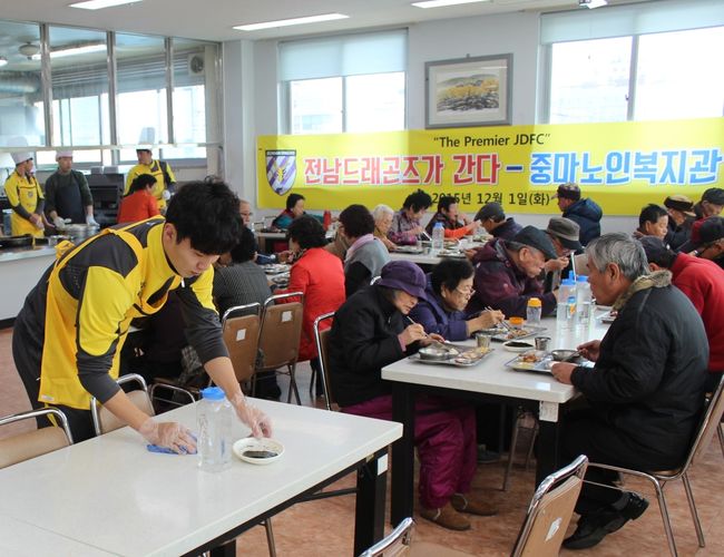 전남 드래곤즈(사장 박세연)가 감사나눔 팬 스킨십 마케팅 '전남 드래곤즈가 간다'를 위해 1일 중마동 중마노인복지관을 방문해 사랑의 급식 봉사활동을 실시했다.