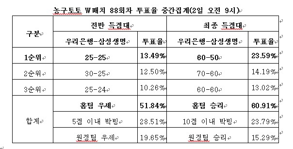 체육진흥투표권 스포츠토토의 수탁사업자인 케이토토는(www.ktoto.co.kr)는 3일(목) 오후 7시에 춘천호반체육관에서 열리는 우리은행-삼성생명전을 대상으로 한 농구토토 W매치 88회차 투표율을 중간 집계한 결과, 전체 참가자의 60.91%가 홈팀 우리은행의 승리를 예상하는 것으로 나타났다고 밝혔다.