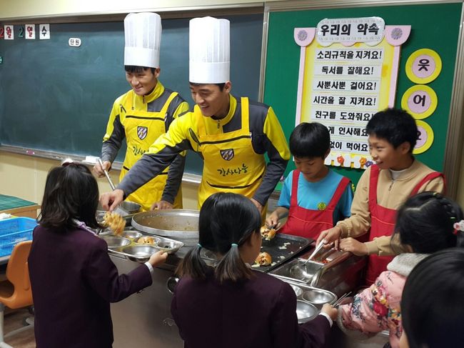 선수들은 각 교실에서 앞치마를 두르고 학생들에게 맛있는 음식을 배식 했다. 배식 후에는 학생들과 사진을 찍으며 사인을 했다. 마지막으로 학생들에게 경기장을 찾아와 응원해준 것에 대한 감사 인사도 잊지 않았다.