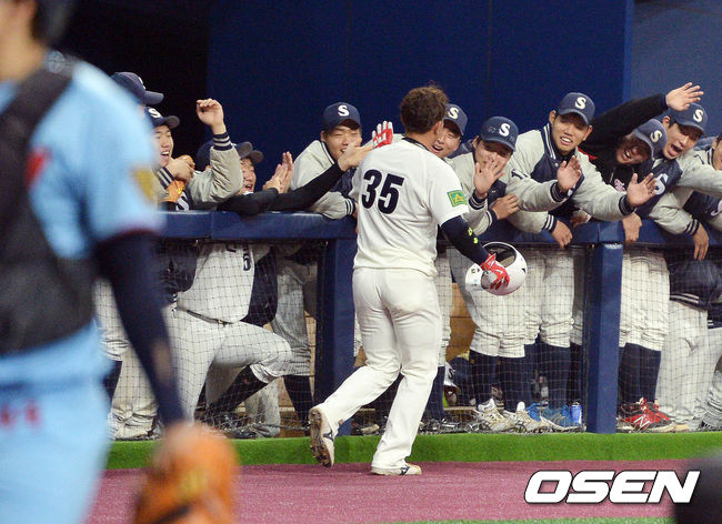 3일 오전 서울시 고척스카이돔에서 진행된 '2015 대한민국 야구대제전' 신일고와 휘문고의 8강전 경기, 2회말 신일고 김근형의 적시타때 득점을 올린 송상훈이 더그아웃에서 팀원들과 환호하고 있다.