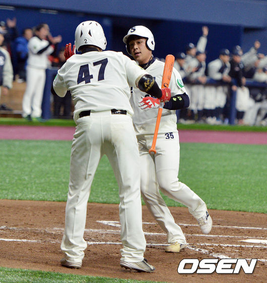 3일 오전 서울시 고척스카이돔에서 진행된 '2015 대한민국 야구대제전' 신일고와 휘문고의 8강전 경기, 2회말 신일고 김근형의 적시타때 득점을 올린 송상훈이 환호하고 있다.