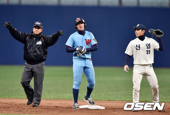 3일 오전 서울시 고척스카이돔에서 진행된 '2015 대한민국 야구대제전' 신일고와 휘문고의 8강전 경기, 3회초 무사에서 휘문고 박민우가 2루타를 치고 타임을 외치고 있다.