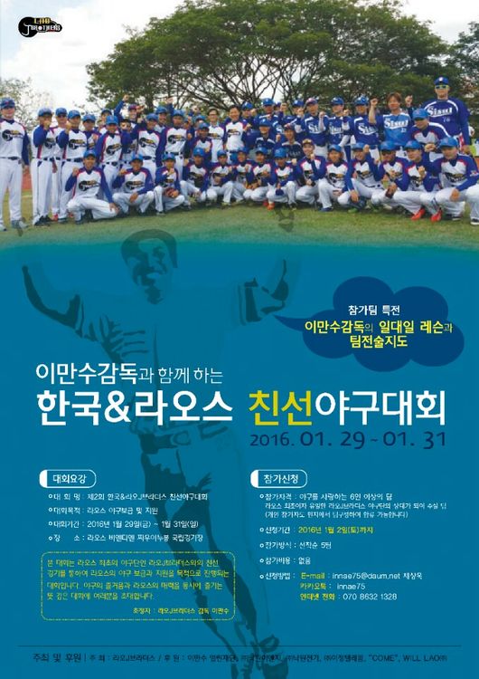 이 대회는 라오스 최초의 야구단인 라오J브라더스와의 친선경기를 통해 라오스의 야구 보급과 지원을 목적으로 한다. 주최 측은 “야구를 사랑하는 6인 이상의 팀이라면 선착순 5팀으로 누구나 참가할 수 있으며 개인 참가자도 현지에서 팀을 구성해 합류가 가능하다”고 알렸다. 신청 기간은 내년 1월 2일까지다.