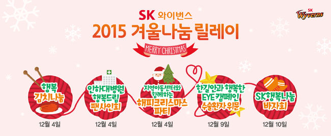 SK와이번스(대표이사 임원일)는 오는 4일(금)부터 10일(목)까지 ‘행복더하기 겨울나눔 릴레이’ 봉사활동을 실시한다.