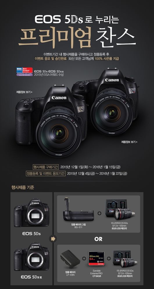 이벤트 참여 방법은 2016년 1월 15일까지 EOS 5Ds 또는 EOS 5Ds R을 구매 후 2016년 1월 22일까지 캐논 공식 홈페이지에 정품 등록 및 이벤트 응모를 완료하면 된다. 이벤트 참가자 전원에게 리미티드 에디션으로 제작된 'EOS 5Ds의 미니어처 8GB USB 메모리'와 함께 '정품 배터리 그립(BG-E11)' 또는 '정품 배터리(LP-E6N)와 64GB CF 메모리'의 구성 중 고객이 직접 선택한 사은품을 추가 제공한다.