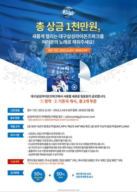 삼성 라이온즈가 2016년 개장하는 대구 삼성 라이온즈 파크를 가득 채워줄 새로운 응원가를 공모한다.