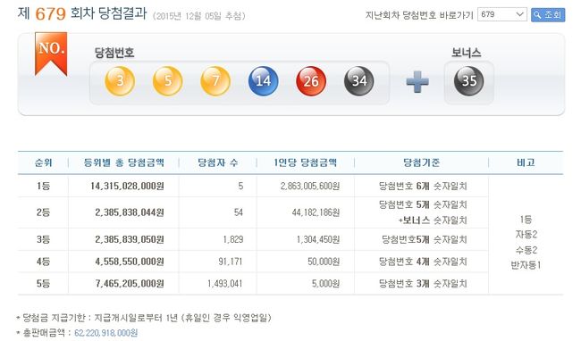 [OSEN=이슈팀] 12월 5일 저녁 추첨 된 제 679회차 로또 당첨번호가 3, 5, 7, 14, 26, 34로 결정 됐다. 그렇게 어려운 번호의 조합 같지는 않은데도 불구하고 6개의 숫자를 모두 맞힌 이들은 전국에서 5명밖에 나오지 않았다.