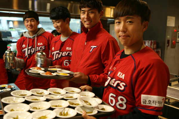 [사진]팬들에서 서빙을 하고 있는 윤완주, 홍건희, 이인행, 고영우(오른쪽부터)/KIA 타이거즈 제공