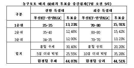 체육진흥투표권 스포츠토토의 수탁사업자인 케이토토는(www.ktoto.co.kr)는 12월 8일(화) 오후 7시에 부산사직실내체육관에서 열리는 부산KT-안양KGC전을 대상으로 한 농구토토 매치 60회차 투표율을 중간 집계한 결과, 44.51%가 원정팀 KGC의 승리를 예상했다고 전했다.
