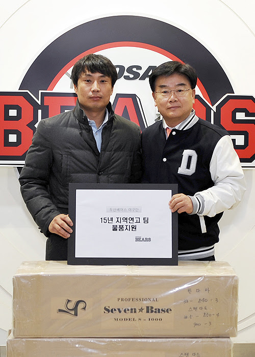 두산 베어스가 8일 오전 10시에 서울시 고등학교 야구팀 감독과 코치들을 사무실로 초청해 5000만원 상당의 경기용 배트를 비롯한 야구 용품을 전달했다.