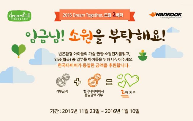한국타이어가 온라인 기부 사이트 드림풀을 통해 ‘2015 드림 투게더, 드림 두 배 더’ 캠페인을 실시한다.