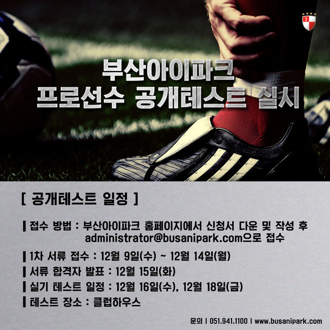 서류 심사와 실기 테스트로 나눠 진행되는 공개테스트에 참가를 원하는 선수는 부산아이파크 공식 홈페이지의 공지사항을 통해 제출 서류를 내려 받은 후 이메일(administrator@busanipark.com)로 신청 가능하다.