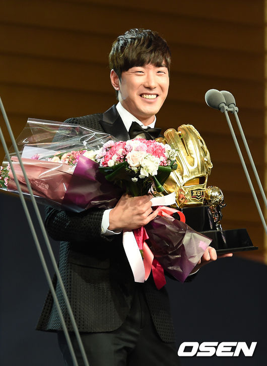 김재호는 8일 양재동 더케이호텔 그랜드볼룸에서 열린 '2015 타이어뱅크 KBO 골든글러브 시상식'에서 김하성(넥센), 김상수(삼성) 등을 제치고 유격수 골든글러브를 수상했다. 김재호는 유효표 358표 중 188표를 거둬 김하성(110표)에 앞섰다.