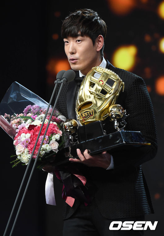 김재호는 8일 양재동 더케이호텔 그랜드볼룸에서 열린 '2015 타이어뱅크 KBO 골든글러브 시상식'에서 김하성(넥센), 김상수(삼성) 등을 제치고 유격수 골든글러브를 수상했다.