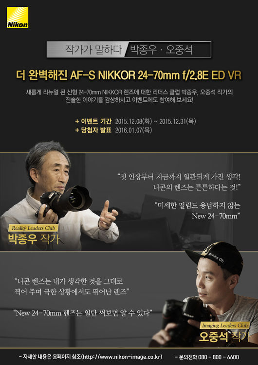 이번 리뷰는 'AF-S NIKKOR 24-70mm f/2.8E ED VR'의 특장점을 독자들에게 보다 객관적으로 소개하고, 촬영한 작품을 통해 생생한 표현력을 전달하고자 기획했다. 특별히, 니콘 리더스 클럽 소속이자 국내에서도 유명한 박종우, 오중석 작가가 리뷰어로 참여해 퀄리티를 더한다.