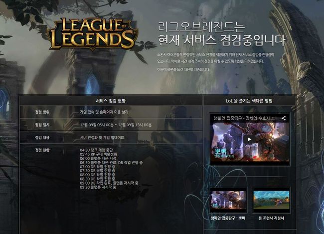 라이엇게임즈는 9일 게임 서버 안정화 및 업데이트를 위한 롤점검을 진행하며 패치 노트를 공개했다. 오전 6시부터 오후 1시까지로 예정된 이번 점검은 2015시즌 마지막 패치인 5.24패치를 적용한다. 5.24패치에는 챔피언 밸런스 조정과 뽀삐 리메이크, 2015눈맞이축제 등이 포함됐다.