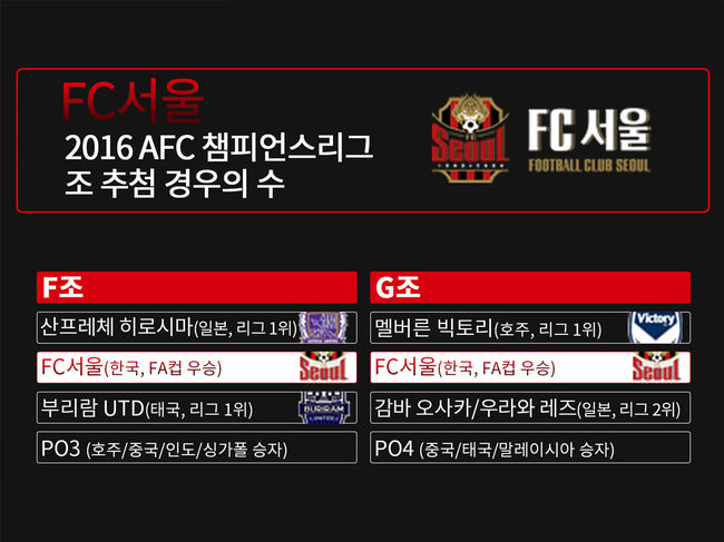 오는 10일 오후 5시(이하 한국시간) 말레이시아 쿠알라룸푸르에서 2016 아시아축구연맹(AFC) 챔피언스리그 조 추첨을 시작으로 아시아 축구 축제의 화려한 막이 열린다. FA컵 우승을 차지하며 4년연속 AFC 챔피언스리그 출전권을 획득한 FC서울은 2016 AFC 챔피언스리그 조추첨 시스템에 따라 F조 또는 G조에 합류하게 된다.