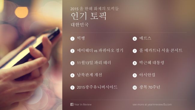 페이스북이 2015년 1월부터 12월 사이 작성된 게시물 중 자주 언급된 내용들을 익명으로 집계해 분석한 '2015년 올 한해 화제의 토픽들' 순위를 살펴보면, 신곡 'LOSER(루저)'로 큰 사랑을 받은 '빅뱅', 세기의 대결로 화제를 모은 '메이웨더 vs 파퀴아오 경기', 전 세계인의 마음을 아프게 했던 '11월 13일 파리 테러' 등이 국내 페이스북 사용자들 사이에서 가장 많이 회자된 것으로 나타났다.