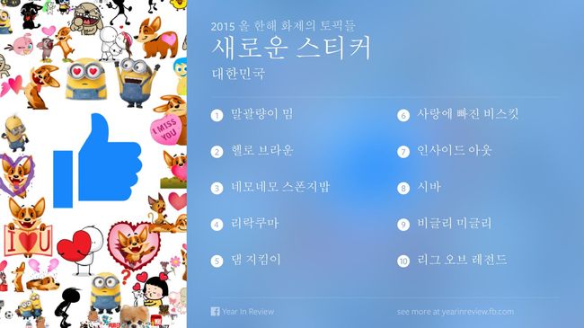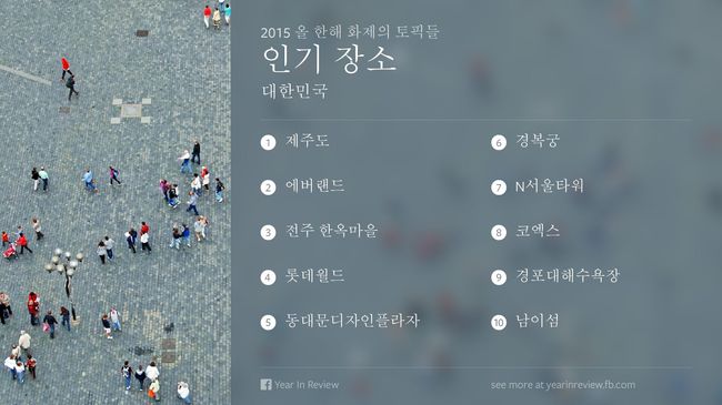 아울러 '제주도', '에버랜드', '전주 한옥마을', '롯데월드', '동대문디자인플라자'는 국내 페이스북 사용자들 사이에서 가장 인기 있는 장소로 선정됐다. 페이스북 사용자들에게 무료로 제공되며 큰 인기를 얻고 있는 페이스북 스티커 중에서는 국내 디자이너가 제작한 '말괄량이 밈', '헬로 브라운' 등이 가장 큰 사랑을 받았다.