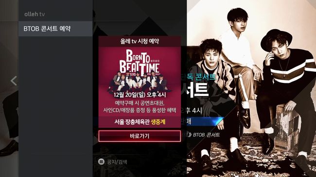 KT(www.kt.com, 회장 황창규)의 IPTV 서비스 올레 tv가 아이돌 그룹 '비투비(BTOB)'의 콘서트를 유료 생중계한다고 10일 밝혔다.