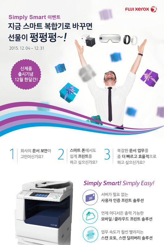 한국후지제록스(대표 우에노 야스아키, www.fujixerox.co.kr)가 스마트한 업무환경을 지원하는 새로운 오피스 솔루션을 구입하는 신규 소비자를 대상으로 스마트밴드, 미니빔 등 풍성한 선물을 증정하는 연말 이벤트를 12월 31일까지 진행한다.