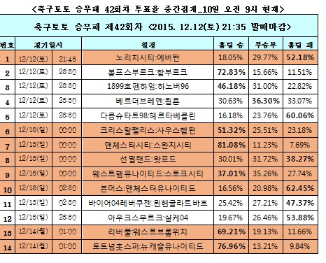 해외 프로축구 14경기 대상 축구토토 승무패 42회차 14경기 투표율 중간집계 결과