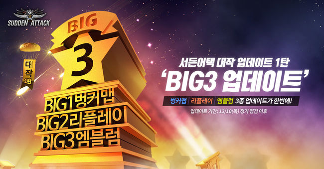 ㈜넥슨은 11일 넥슨지티㈜가 개발한 FPS 게임 ‘서든어택’의 겨울 대규모 업데이트 ‘대작’을 공개하고 1탄 ‘빅3’ 업데이트를 실시했다.