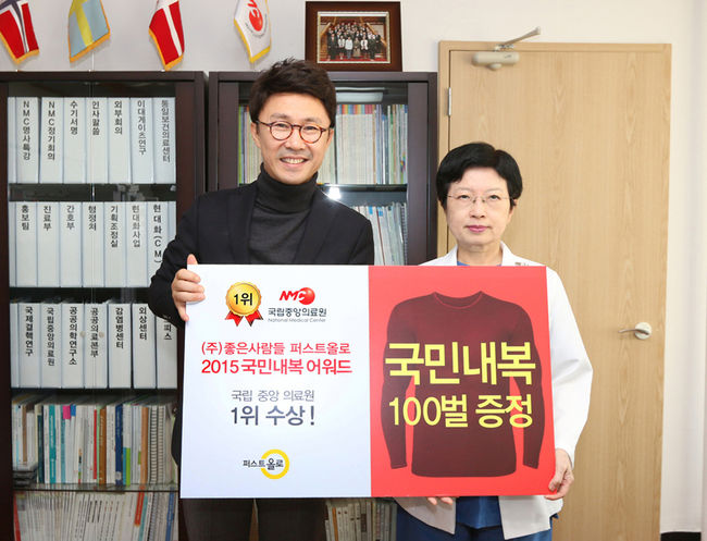 11일 국립중앙의료원에서 진행된 '국민내복 어워즈' 시상식에는 좋은사람들 윤우환 대표와 국립중앙의료원 안명옥 원장을 포함해 임직원 및 관계자들이 참석한 가운데 뜻 깊은 나눔의 시간을 가졌다. 국립중앙의료원 관계자는 기증받은 '국민내복'은 병원 내 환우들에게 전달하여 국민의 따뜻한 마음을 함께 나누겠다고 밝혔다.