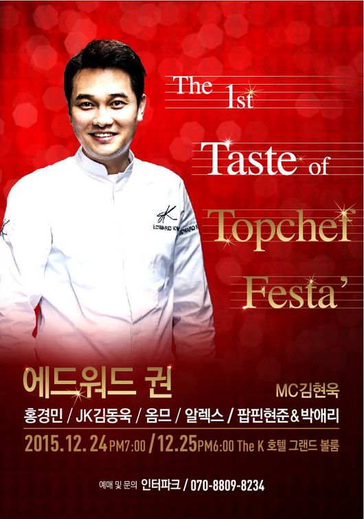 오는 24일과 25일 서초구 양재동 더케이호텔서울(사장 강병직)에서는 '2015 에드워드 권 셰프 크리스마스 갈라 디너쇼'가 진행된다. 이번 행사에서는 △노르웨이산 훈제연어와 샤프란 레몬 파우더, △땅콩호박 벨루테와 사과 베이컨 쳐트니, △모히또 셔벳, △에드워드 권 스타일의 써프 앤 터프, △한라봉 화이트 초콜렛 무스와 복분자 등 에드워드 권이 직접 조리하는 '만찬'과 함께 코스별 요리 해설 및 그림 같은 플레이팅 등을 즐길 수 있다.