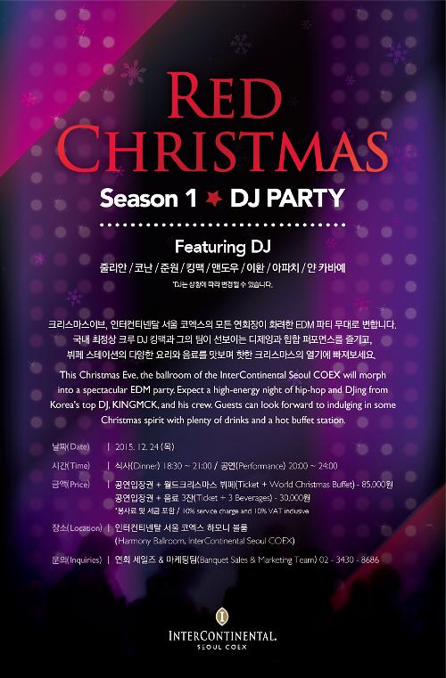 인터컨티넨탈 서울 코엑스가 대형 연회장인 하모니볼륨에서 국내 최정상 크루인 DJ킹맥과 그의 팀이 함께 펼치는 화려한 디제잉 파티와 세계 각국의 크리스마스 요리를 경험할 수 있는 '레드 크리스마스(Red Christmas)'를 오는 24일 밤 단 하루 선보인다. 이번 '레드 크리스마스'에 참가하는 디제이로는 국내 DJ 서바이벌 프로그램에서 1위를 차지한 디제이 "킹맥(Kingmck)"을 비롯하여 벨기에 출신으로 '비정상회담'에서의 유명세를 이어가고 있는 '어바웃 쥴리안(About Julian)', 프랑스 출신의 '얀 카바예(Yann Canvaille)', 국내 최고의 디스코 마스터인 '코난(Conan)'과 모델 출신 DJ인 '환(Ffan)', 국내 최정상급 DJ 그룹 소속의 '앤도우(Andow)', '준원(Juneone)', '아파치(Apachi)' 등 8명의 국내 최고의 DJ들이 모여서 화려한 디제잉과 힙합 퍼포먼스를 펼칠 예정이다.