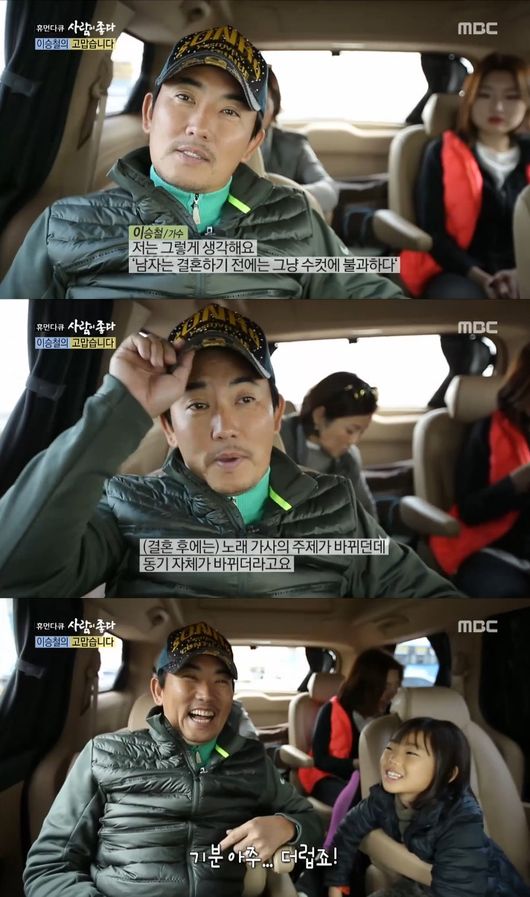 이승철은 12일 오전 방송된 MBC '휴먼다큐-사람이 좋다'(이하 '사람이 좋다')에서 "남자는 결혼하기 전가지 수컷에 불과하다"며 "결혼하고 나서는 가사의 주제가 바뀐다. 동기자체가 바뀌었다. 그전에는 사랑과 이별을 주제로 했다면 결혼 이후에는 행복과 희망을 노래하게 된다"고 말했다.