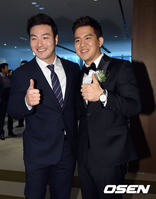 결혼식에 참석한 박병호가 김민성과 함께 포토타임을 갖고 있다.