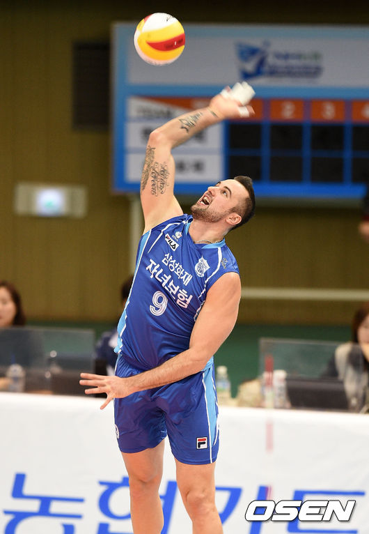 1세트 삼성화재 그로저가 서브를 하고 있다.