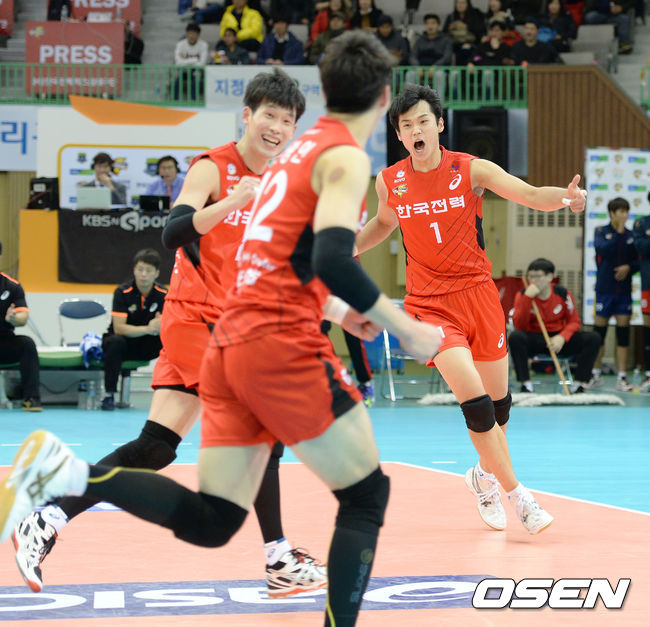 3세트 득점에 성공한 한국전력 선수들이 환호하고 있다.