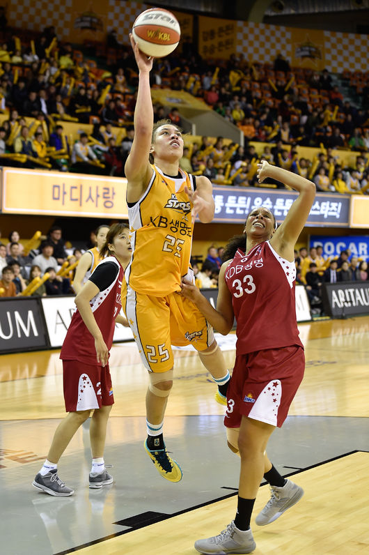 KB스타즈는 12일 청주체육관에서 열린 2015-2016 여자프로농구 3라운드 KDB생명과 원정경기에서 77-55로 승리를 거뒀다. 대승 소식을 전한 KB스타즈는 2연패에서 탈출, 6승 7패가 돼 분위기 반전의 발판을 마련했다. 9연패의 수렁에 빠진 KDB생명은 2승 11패로 최하위에 머물렀다.