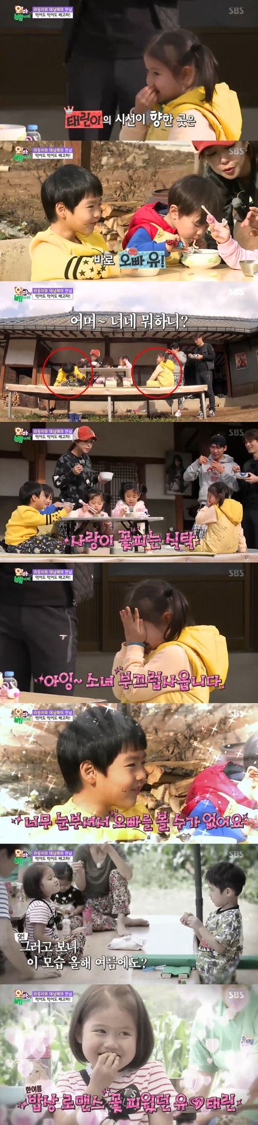 두 사람의 밥상 로맨스는 이번이 처음이 아니다. 앞서 올해 여름 두 사람은 감자를 먹던 중 한 차례 '사랑이 꽃피는 식탁'을 연출했던 터. 두 아이의 솔직담백한 로맨스에 슈와 리키는 웃음을 터뜨렸다.