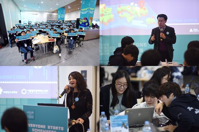 [사진] 왼쪽 위부터 시계 방향으로 '아워 오브 코드 히어로' 행사를 마친 뒤 참여 학생들이 환호하고 있다. 인사말을 하는 박용호 청년위원장(서울창조경제혁신센터장), 인사말을 하는 박선정 한국마이크로소프트 대표 변호사, 코딩을 체험하고 있는 고등학생들. /서울창조경제혁신센터 제공