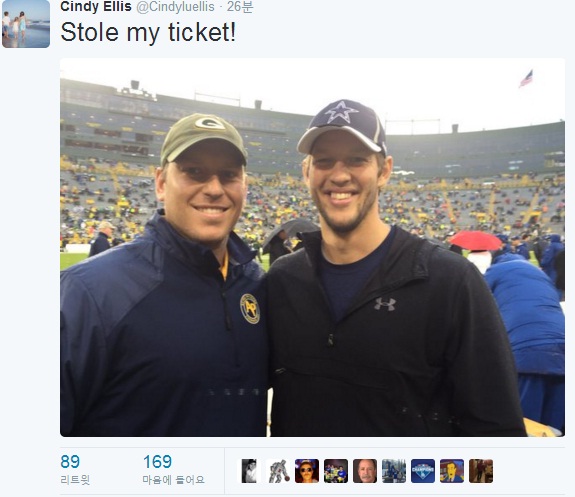 커쇼와 엘리스가 NFL 댈러스 카우보이스와 그린베이 패커스전이 열린 14일(한국시간)위스콘신주 그린베이 램보 필드에서 함께 한 모습이 트위터에 올라왔다.