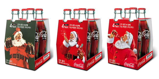 ‘크리스마스 산타 패키지’는 앙증맞은 미니 사이즈인 190ml 코카-콜라 병 4개가 한 세트로 구성된 패키지다. 패키지 겉면에 새겨져있는 ‘코카-콜라와 함께 더욱 짜릿한 크리스마스’라는 문구와 인자한 모습의 산타클로스가 코카-콜라 병을 들고 있는 모습을 통해 함께 나눌 때 더욱 짜릿하고 행복해진다는 메시지를 담았다. 오는 10일부터 이마트에서 8만 세트 한정 판매되며, 가격은 3,980원 이다.