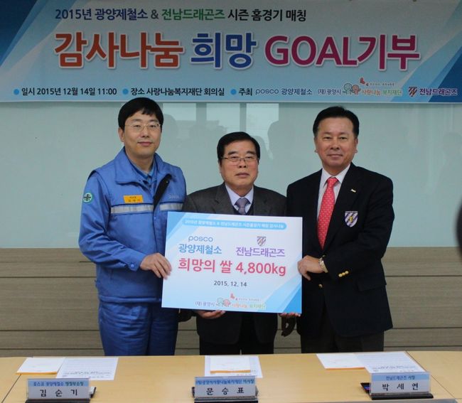 전남드래곤즈(사장 박세연)와 포스코 광양제철소(소장 안동일)가 지역민의 사랑에 보답하고 감사나눔 실천을 위해 14일 오전 11시 (재)광양시 사랑나눔 복지재단(이사장 문승표)을 찾아 백미 4800kg을 기부했다.