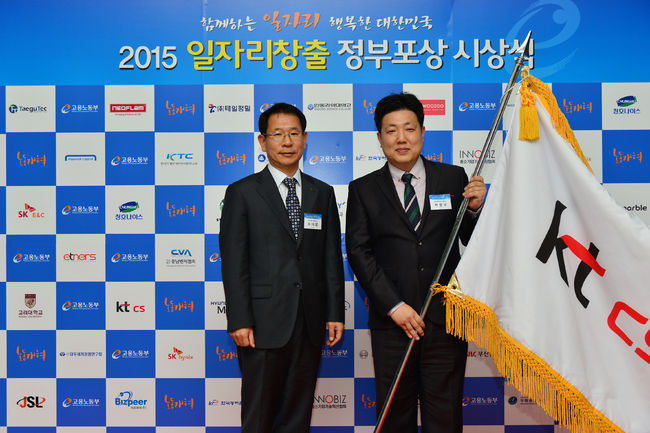 [사진] KT CS 유태열 대표(왼쪽)가 15일 고용불안해소 노력을 인정받아 2015일자리창출 정부 포상 시상식에서 대통령 표창을 수상하고, 기념촬영을 하고 있다. /KT CS 제공