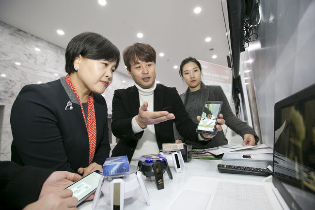 [사진] KT 기가 IoT 사업단장 송희경 전무(왼쪽에서 첫번째)가 ‘KT와 함께하는 IoT 쇼케이스에 선발된 중소기업의 IoT 관련 서비스를 체험하고 있는 모습 /KT 제공