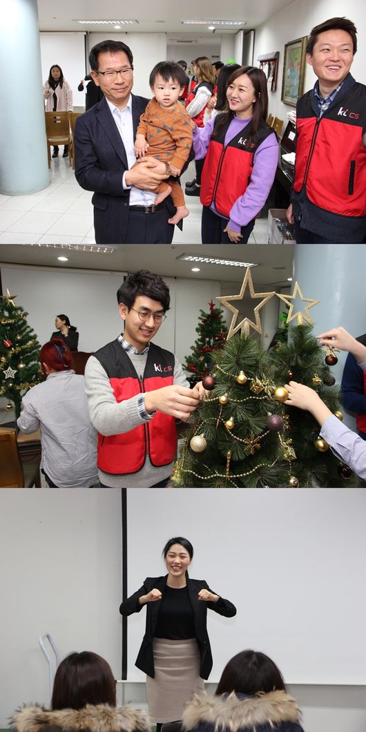 이날 KT CS 홍영숙 사내강사는 두리모 20여명을 대상으로 '직장인 예절 교육'을 진행하고, 20여명의 KT CS 하트너 봉사단은 두리모를 대신해 아이들을 돌보는 봉사활동을 했다. 또한 두리모와 아이들 30여명과 함께 크리스마스 트리를 장식하고, 목도리와 유아용 물통을 선물했다.