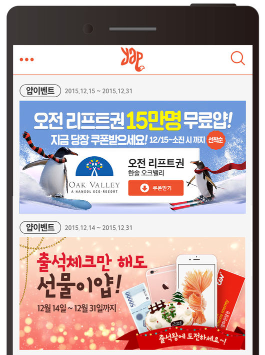 또한 얍(YAP)은 31일까지 '12월의 출석체크 YAP' 이벤트도 진행한다. 얍 앱을 방문해 출석 도장을 찍으면 자동으로 응모되며, 출석 체크 횟수에 따라 추첨을 통해 아이폰 6S(64GB), 신세계 상품권 5만원 권, CGV 1인 2매 영화관람권 등 다양한 선물을 증정한다.