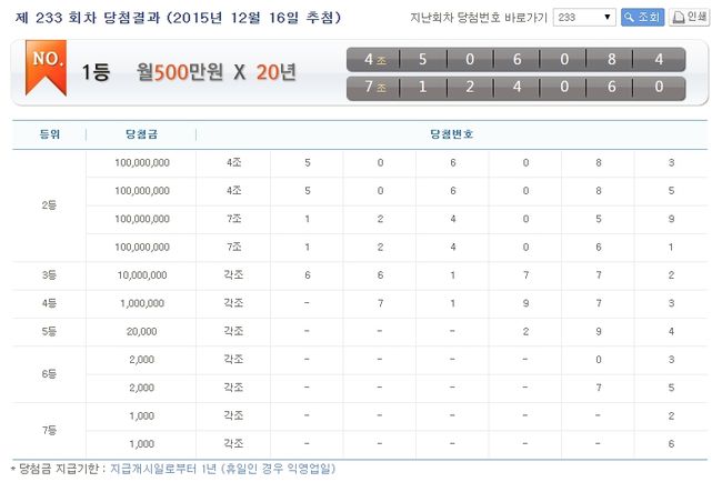 16일 233회차 '연금복권520' 추첨 1등 당첨번호는 '4조 506084'와 '7조 124060'였다.